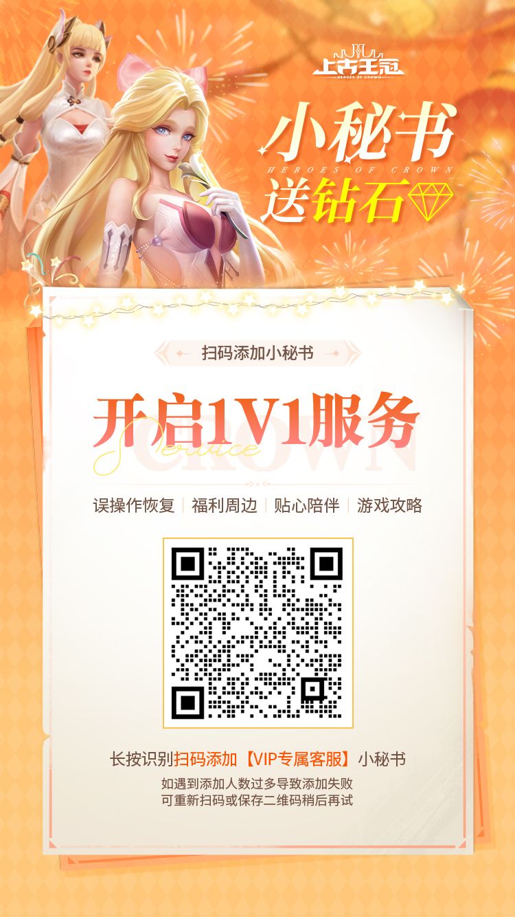 截图至微信扫码添加,或关注“上古王冠”微信公众号,在公众号内对话框输入“秘书”,根据提示添加。